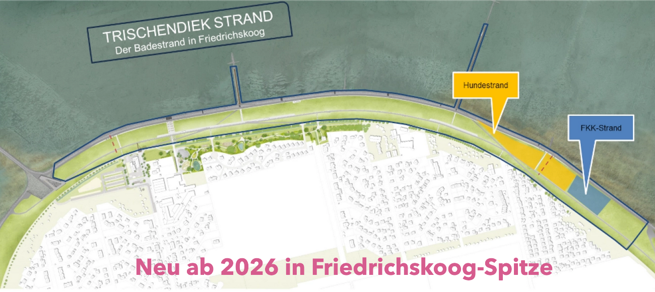 Der „Neue Trischendiekstrand“ in Friedrichskoog-Spitze, ca. 2,5 Kilometer lang und mit 2 Holzstege die in die Nordsee ragen. Der Trischendiekstrand besteht aus einem Hauptstrand (Familienstrand), Hundestrand und FKK-Strand und ist jetzt noch viel Attraktiver wie vorher.